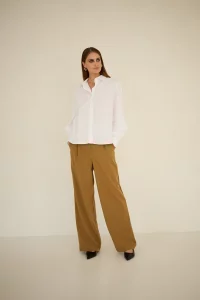 Białą koszulę można wystylizować zarówno w stylu casualowym, jak i biznesowym czy wieczorowym. Na co dzień, możecie do białej koszuli włożyć dżinsy, oversizowy szary sweter oraz czarne botki lub postawić na prostą wersję – koszula, dżinsy oraz mokasyny. W wydaniu biznesowym białą koszulę można zestawić z garniturowymi spodniami, swetrem oraz eleganckimi półbutami. Na wieczór proponujemy zestawić białą koszulę z czarnymi satynowymi spodniami, szpilkami oraz długimi perłami. W Entelier znajdziecie szeroki wybór eleganckich spodni, które będą przepięknie wyglądać z białą koszulą – zarówno nasze cygaretki, jak i szerokie spodnie Vivian czy spodnie Vogue Evening.