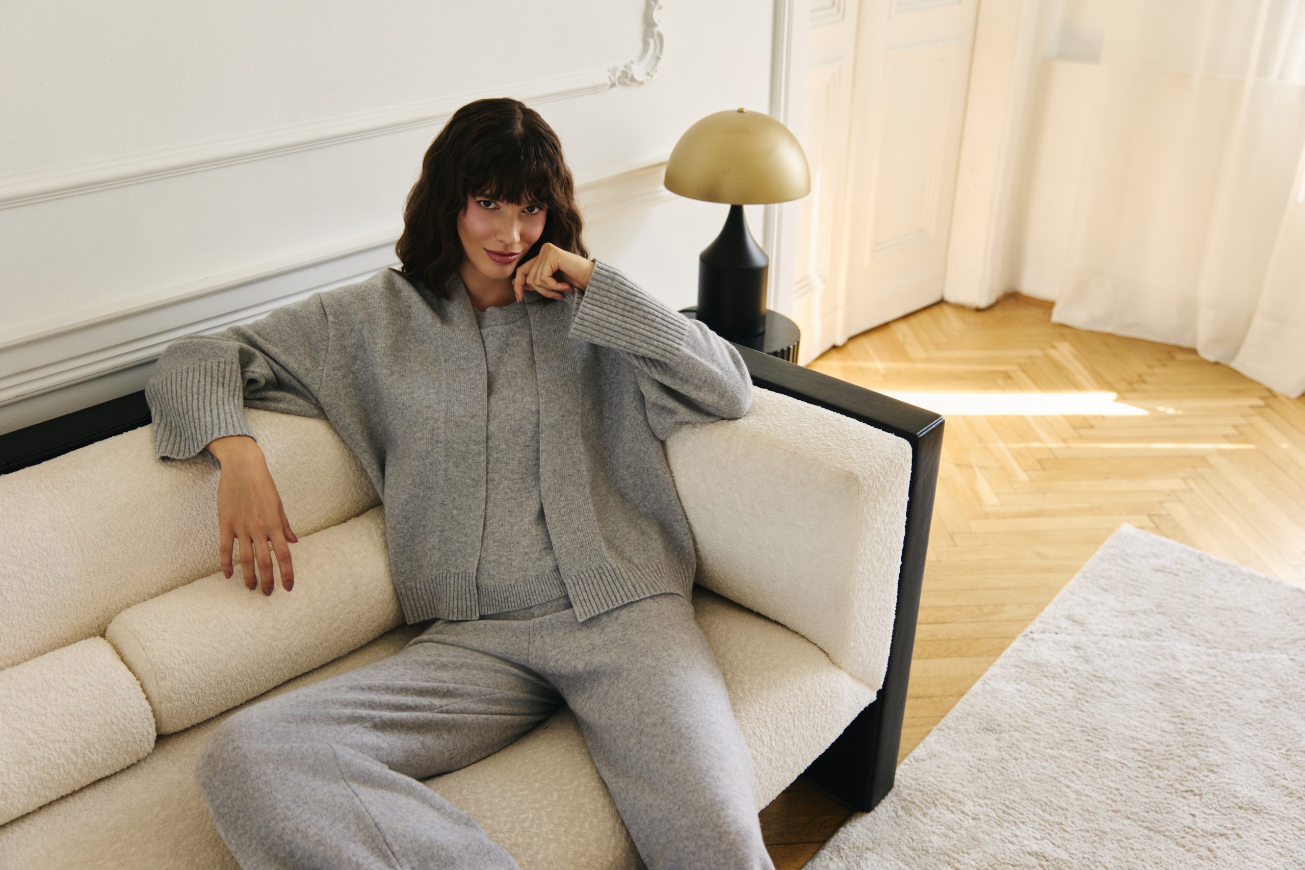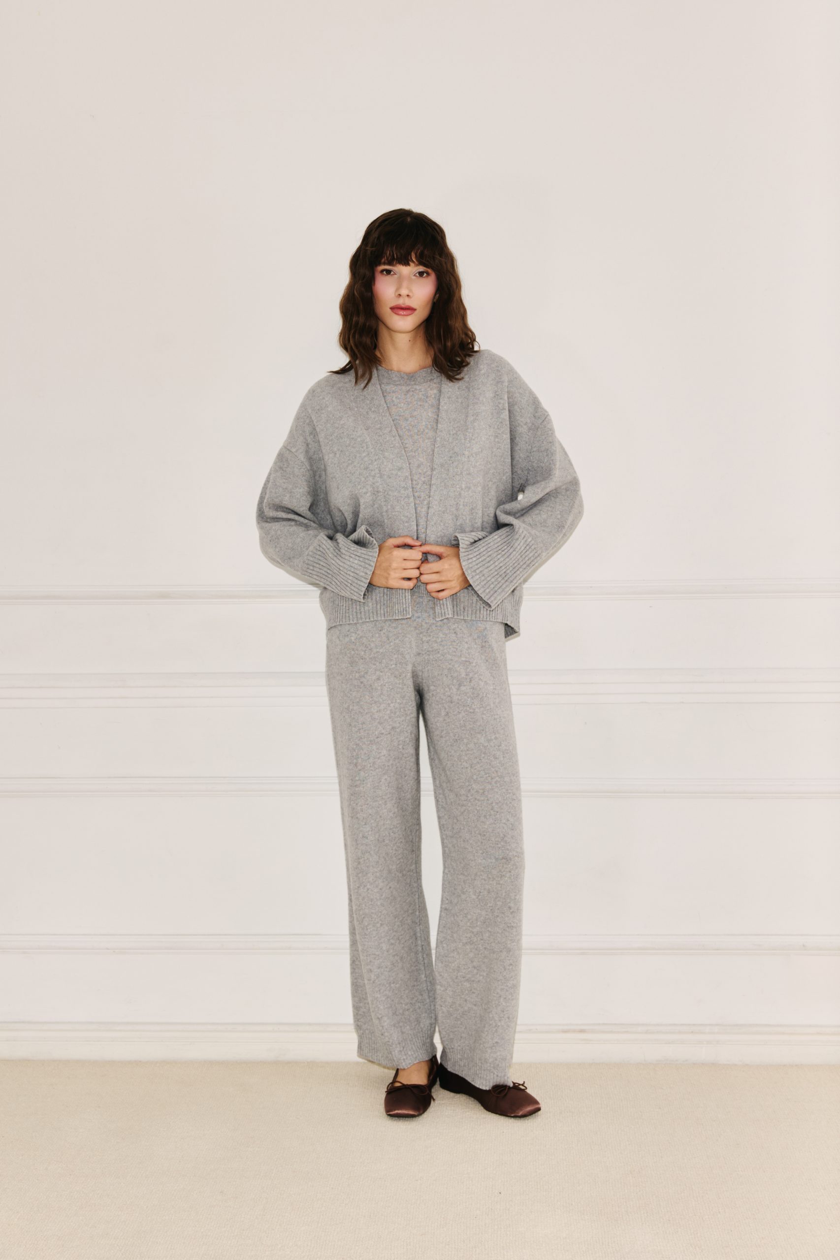 Kardigan Amelie szary to ciepły sweter wykonany z niezwykle miękkiej przędzy merynosa oraz kaszmiru w kolorze jasnej szarości. Sweter ma pudełkowy i luźny fason, lekko opuszczone szerokie rękawy wykończone ozdobnym ściągaczem. Sweter pasuje na każdą sylwetkę