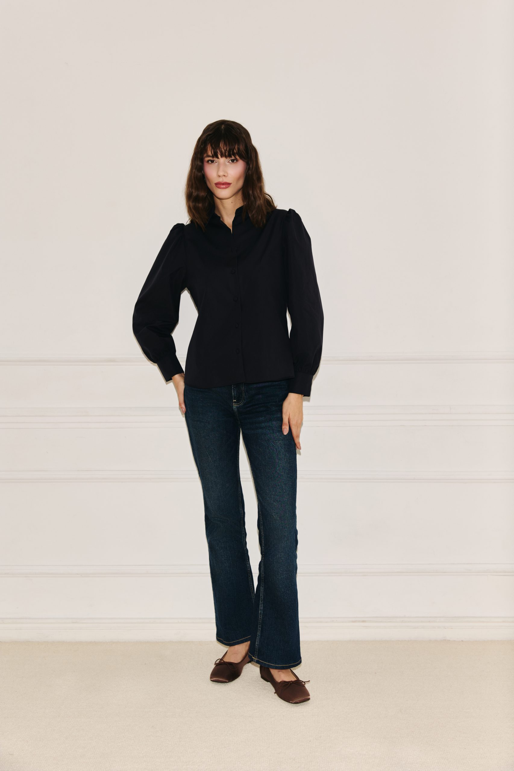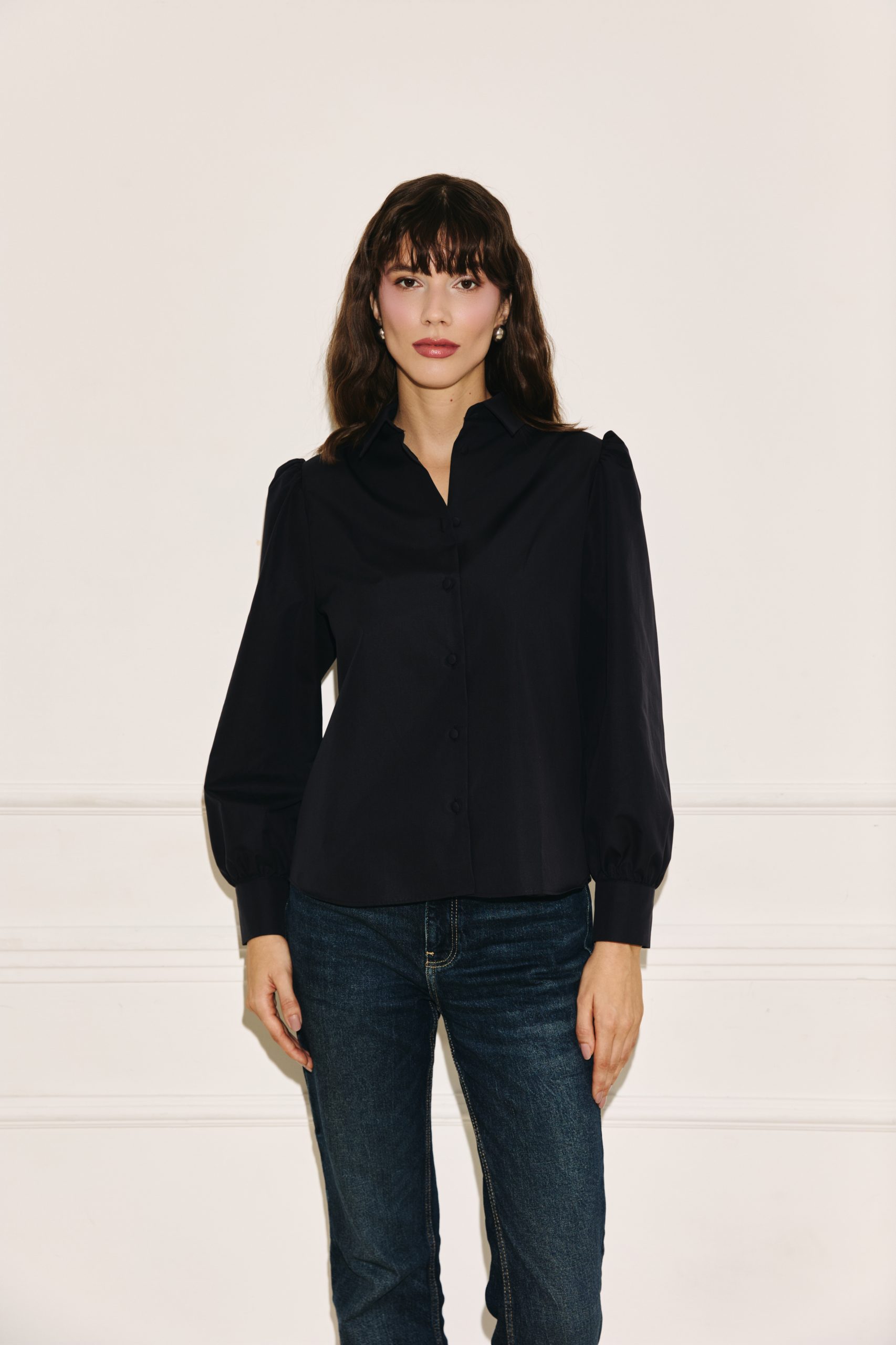 Koszula Ophelia czarna to bawełniana stylowa koszula z bufiastymi rękawami oraz powlekanymi guzikami. Koszula ma klasyczny kołnierzyk, jest nieco krótsza niż klasyczne modele koszul, najlepiej nosić puszczoną luzem na spodnie lub spódnicę. Nadaje się zarówno do eleganckich stylizacji ze spodniami lub spódnicą jak i na codzień do dżinsów.