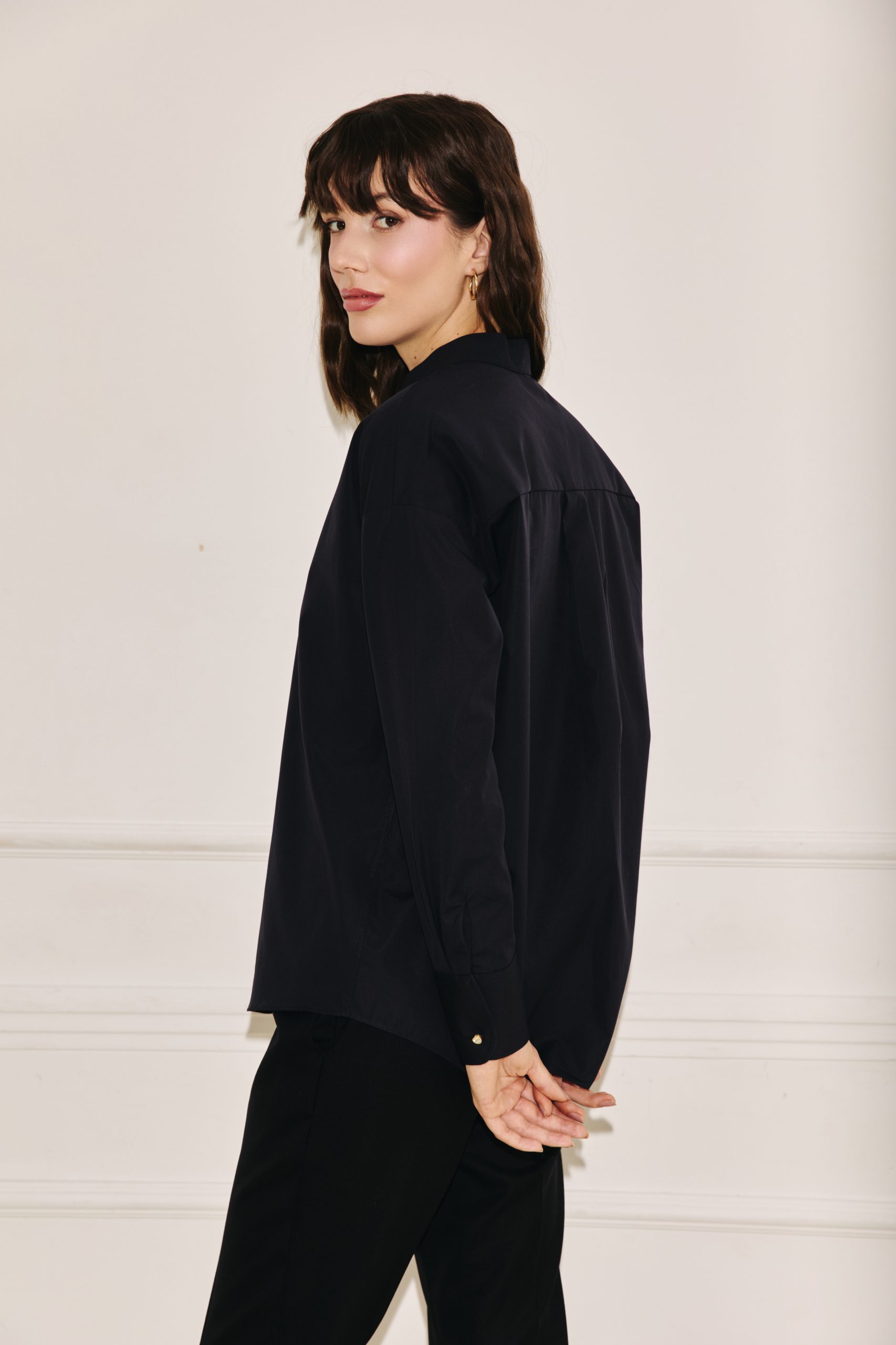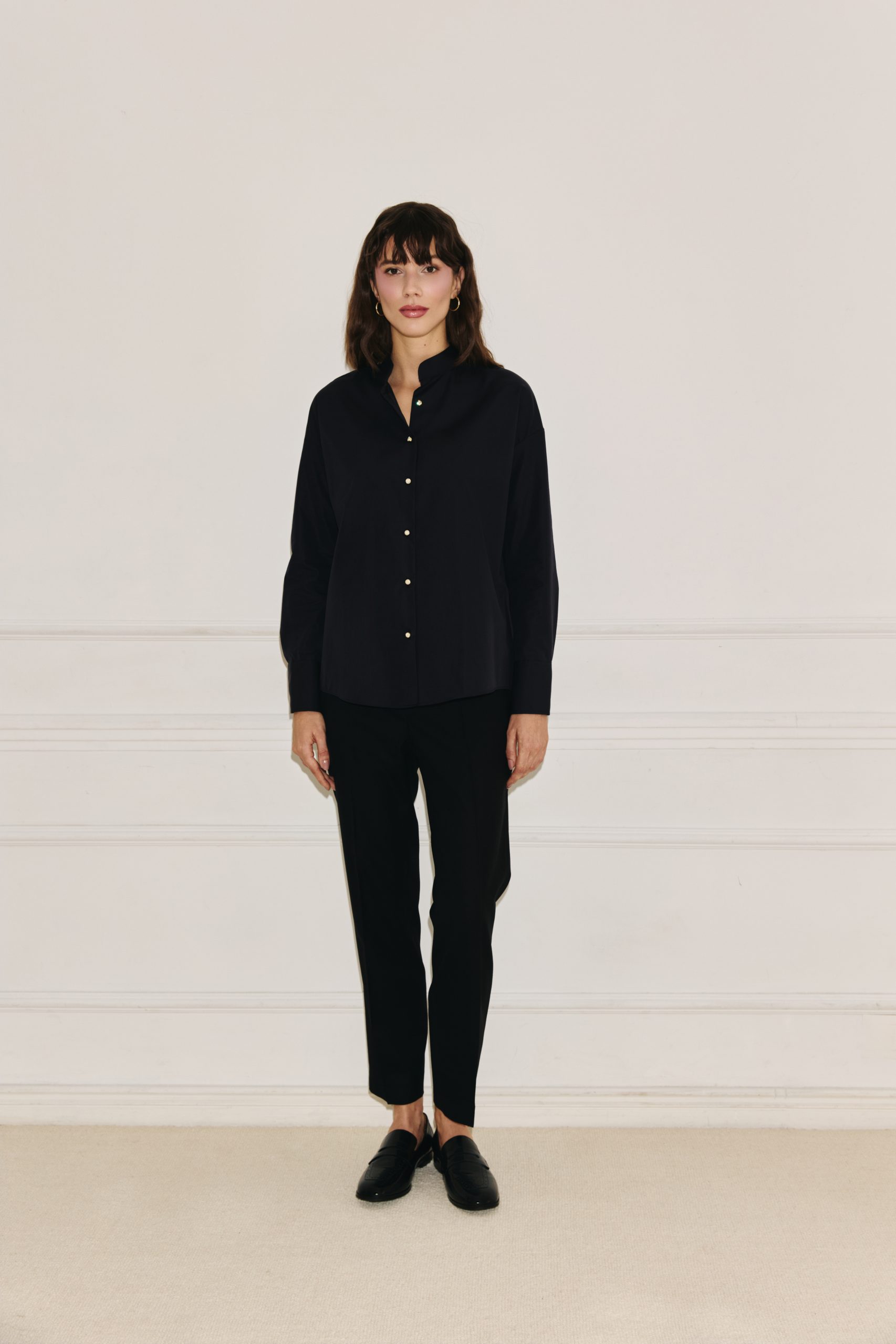 Koszula ze stójką czarna to klasyczna i elegancka koszula o luźnym fasonie, nie taliowana. Koszula ma lekko obniżone ramię dla swobody ruchów, zaokrąglony mankiet na jeden guzik. Koszula wykonana jest z bardzo dobrej jakości tkaniny bawełnianej z podwójnej nici tzw. two-ply. Elementem ozdobnym są kryształowe guziki w złotej obwódce, z francuskiej manufaktury.