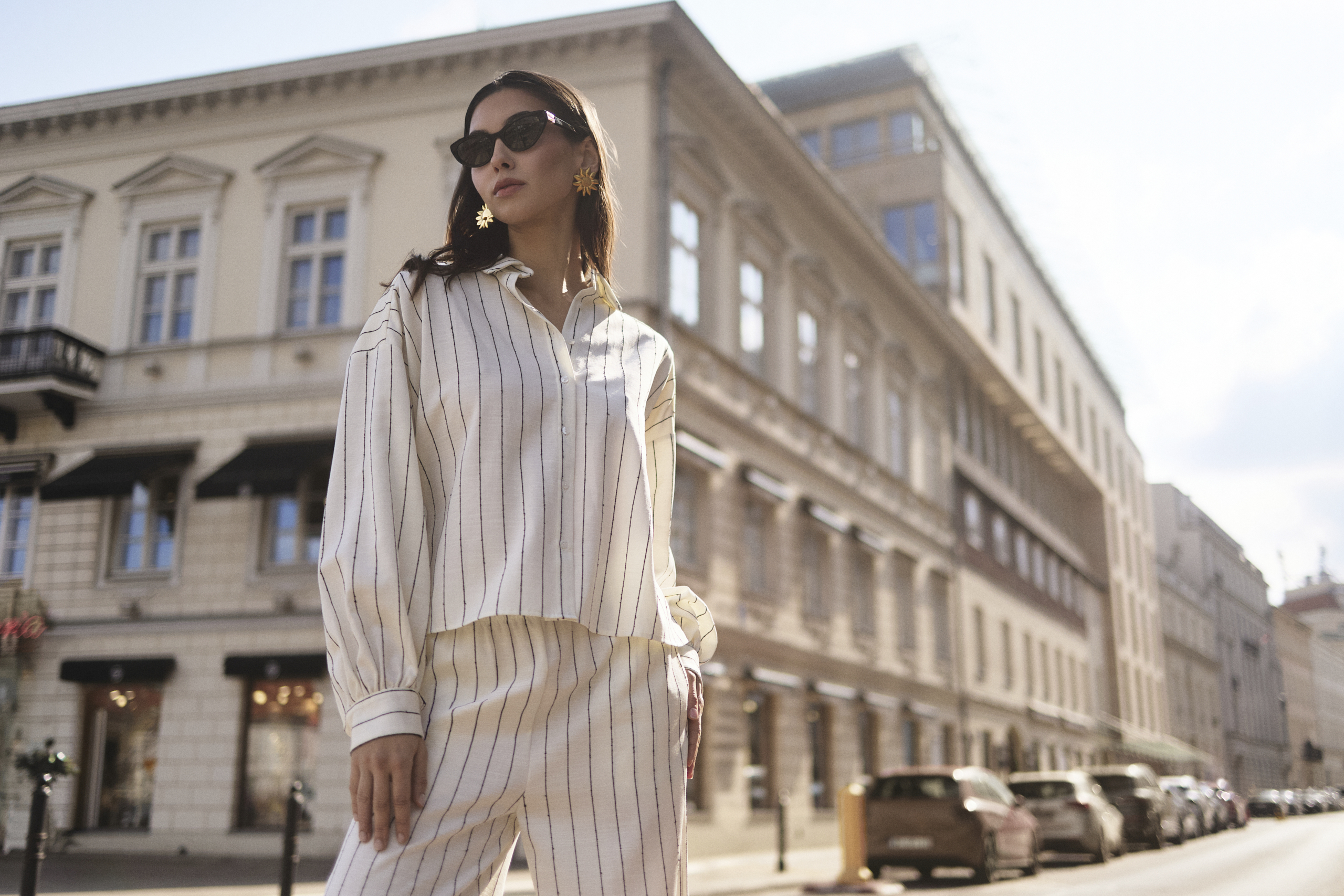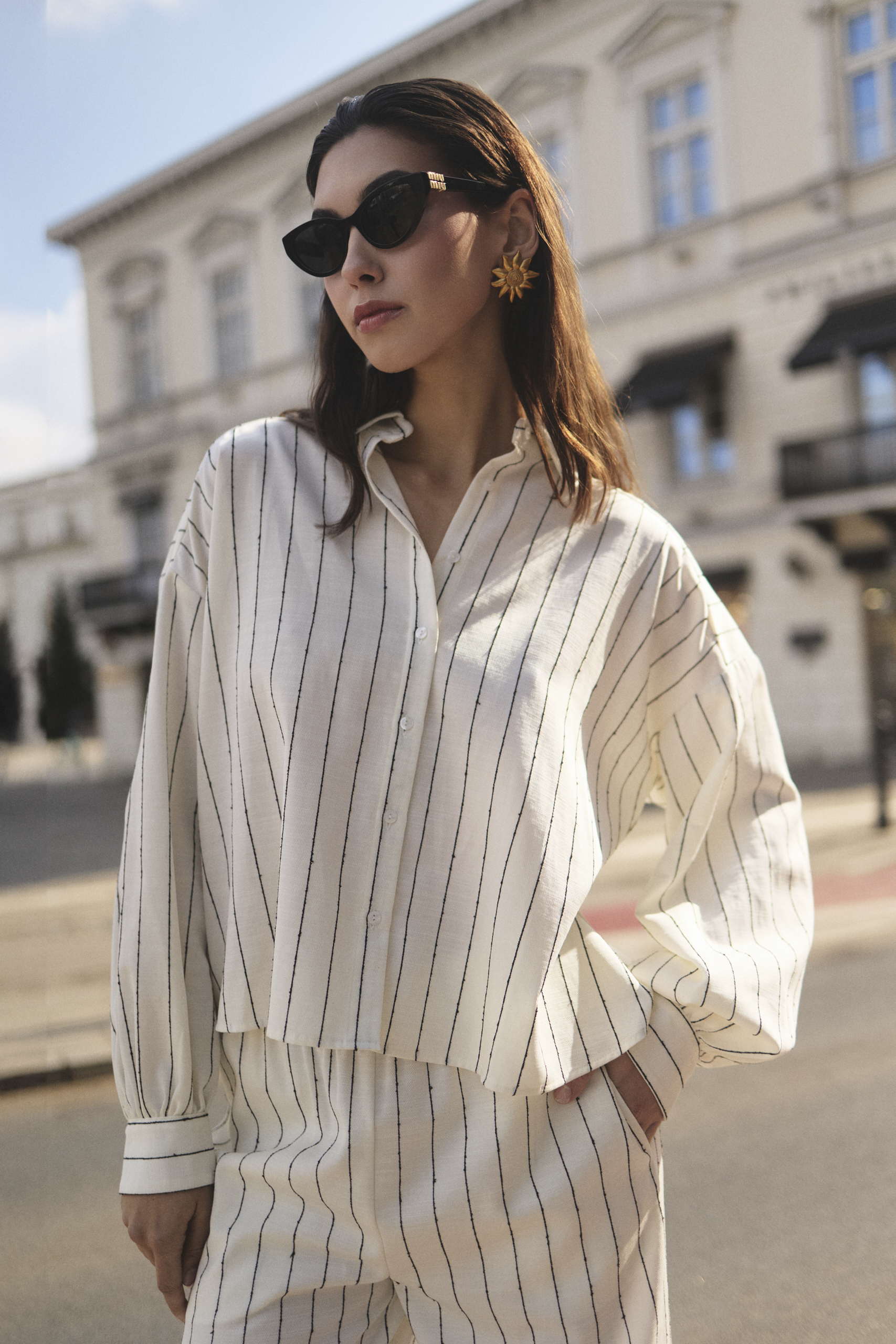 Koszula Ivette to definicja nowoczesnej elegancji połączonej z absolutną wygodą. Wykonana ze szlachetnej mieszanki lyocellu i bawełny w odcieniu ecru, ozdobiona subtelnymi, czarnymi prążkami. To projekt stworzony dla kobiet, które szukają ubrań z charakterem, idealnych do budowania stylowych, miejskich kapsuł.