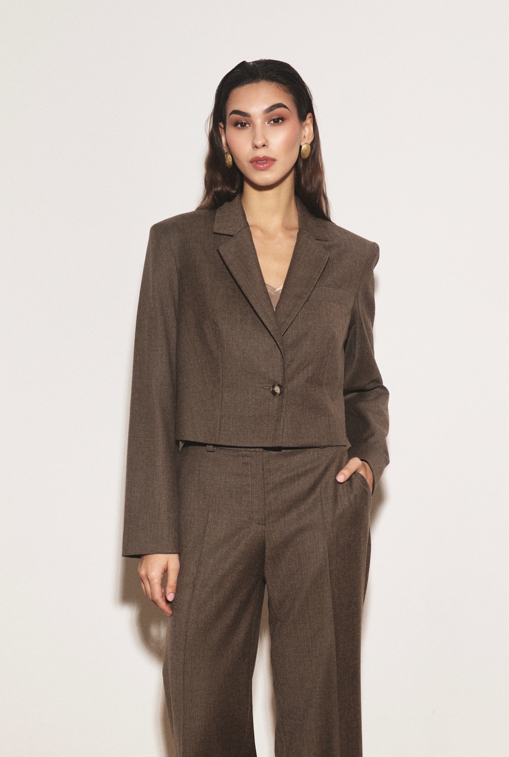 Marynarka pudełkowa Soléne brąz – minimalistyczna w formie, nowoczesna w charakterze – krótka marynarka o pudełkowym kroju to propozycja dla kobiet ceniących szlachetny design i najwyższą jakość naturalnych tkanin. Wykonana z cienkiej wełny w odcieniu złamanego, chłodnego brązu, stanowi doskonałą bazę zarówno do kapsułowej garderoby, jak i odważniejszych, modowych zestawień.
