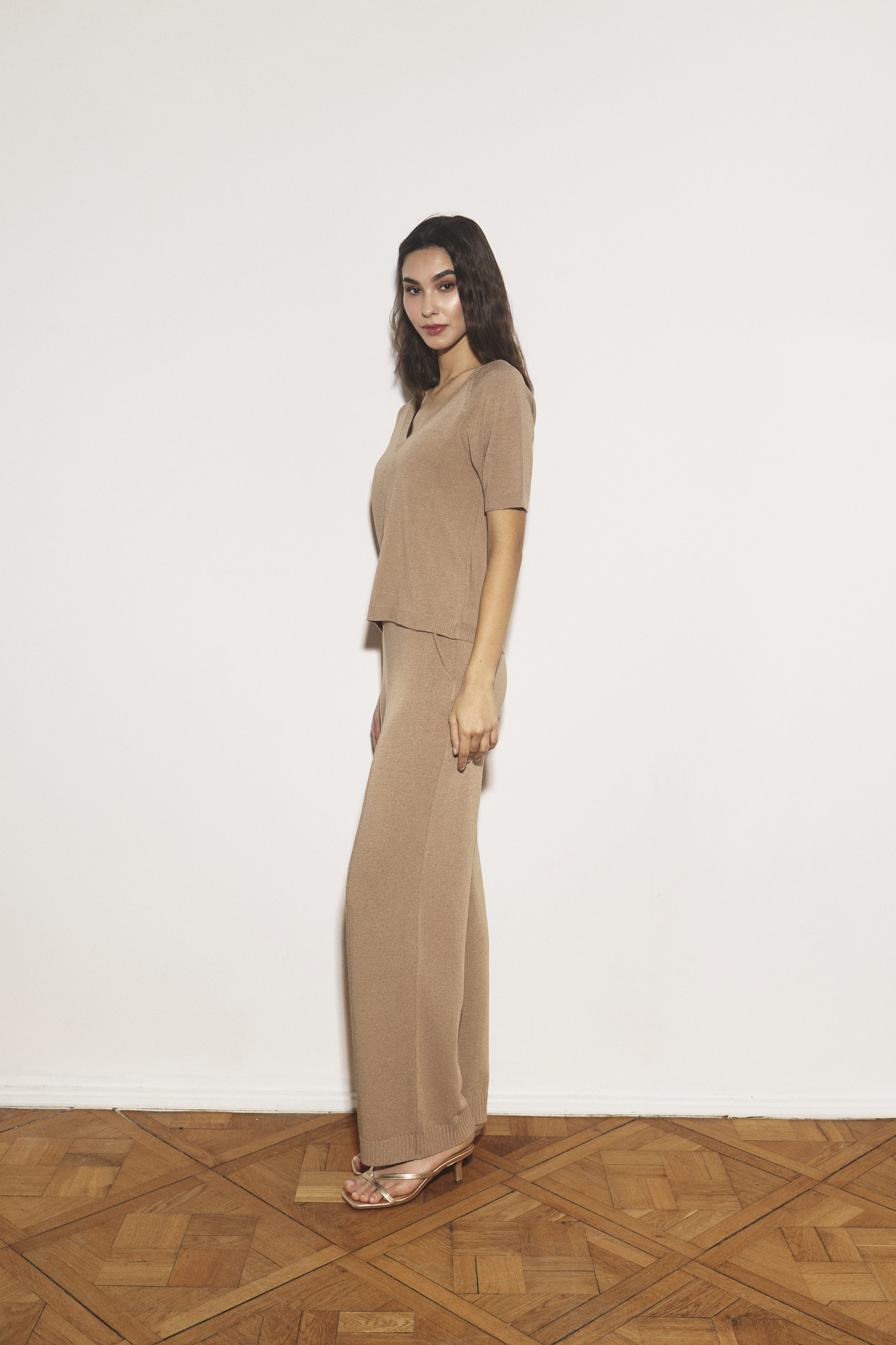 - Wielofunkcyjność: Spodnie tworzą spójny total look ze swetrem pudełkowym Amelié lub bluzką z krótkim rękawem z tej samej dzianiny.
