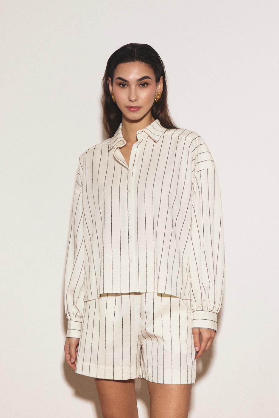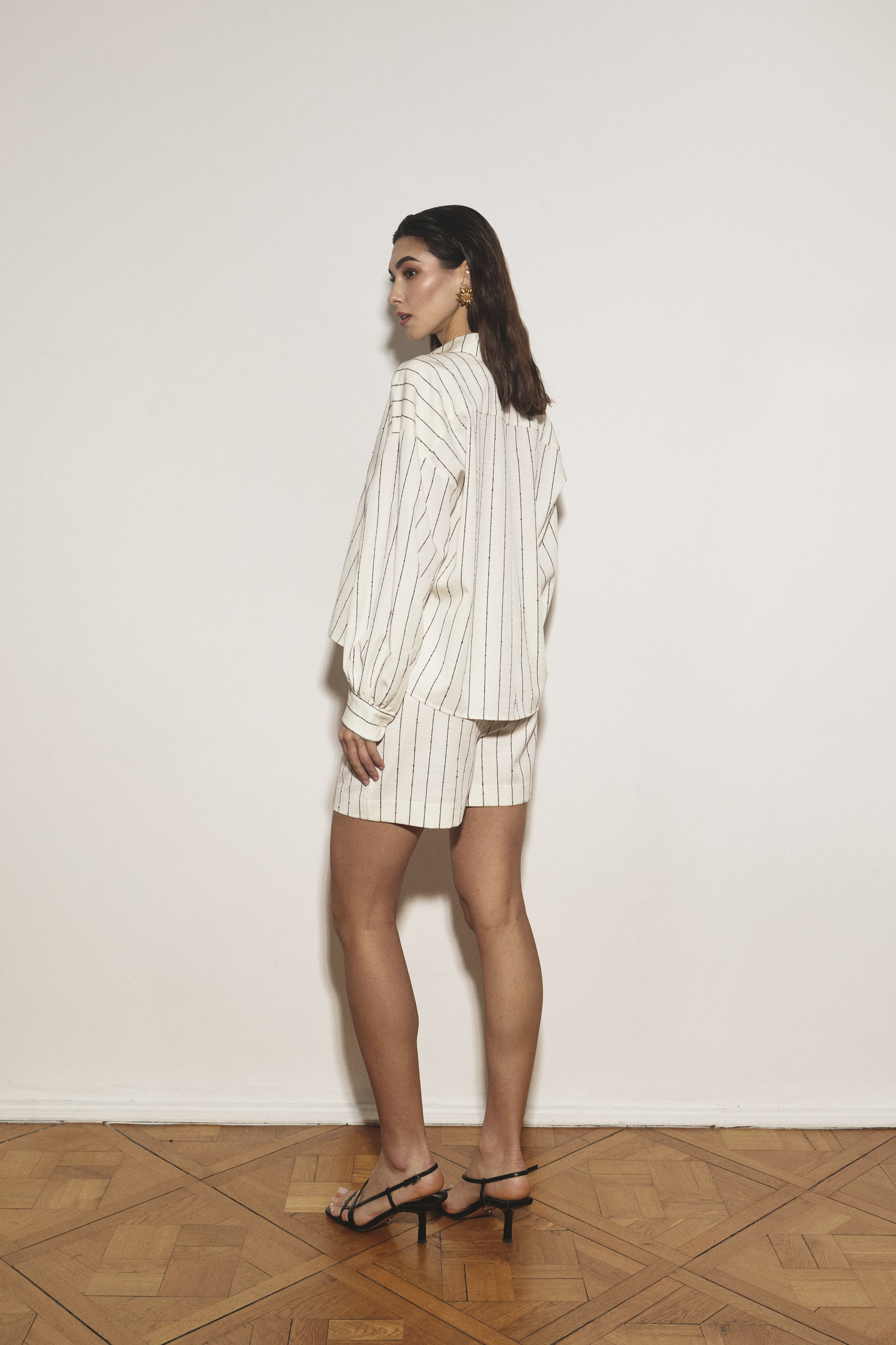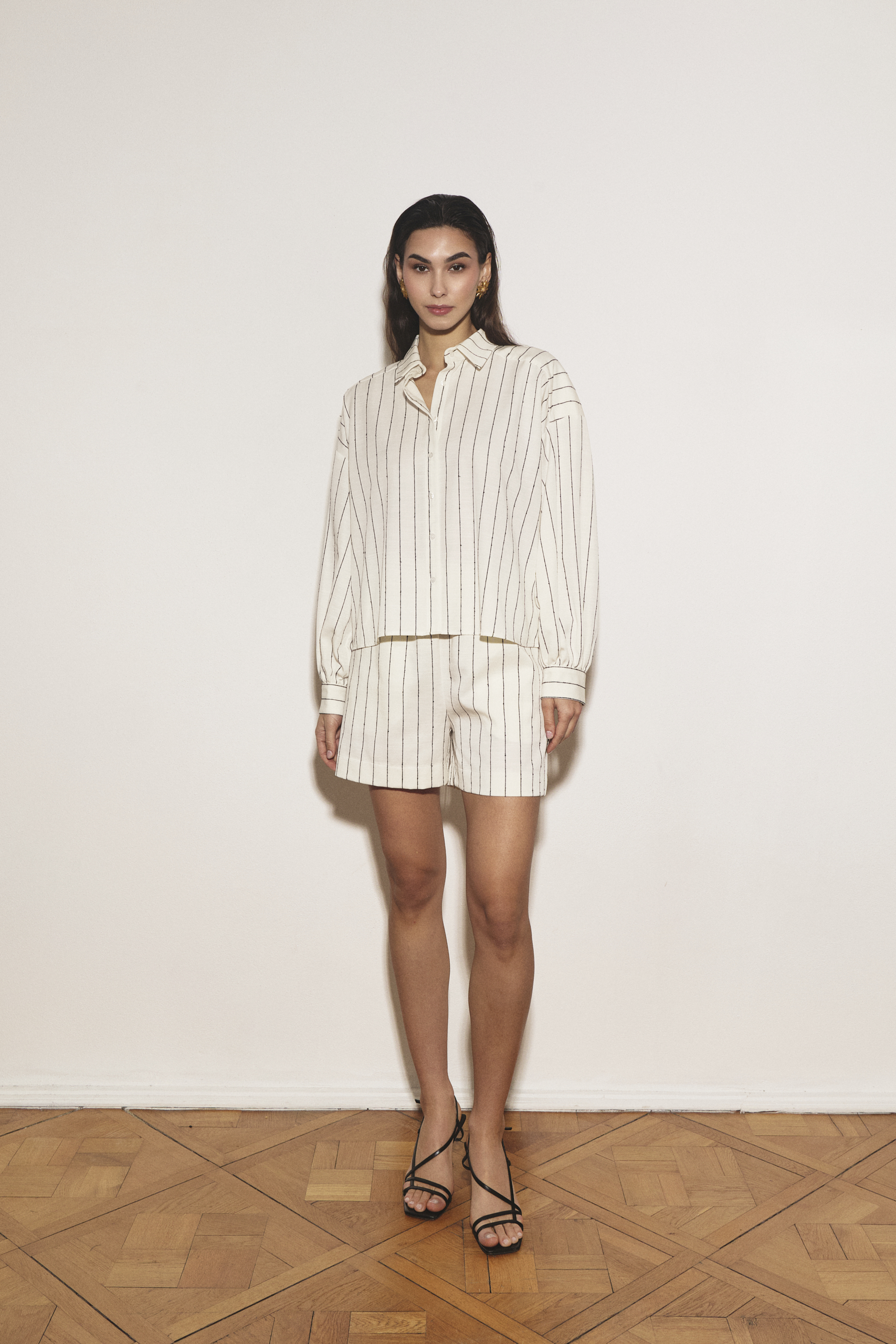 Szorty Yvette to esencja letniego minimalizmu i wygody. Wykonane ze szlachetnej mieszanki lyocellu i bawełny w odcieniu ecru z subtelnymi, czarnymi prążkami. Zaprojektowane, by tworzyć idealną parę z koszulą Ivette, stanowią też bazę do letnich stylizacji.